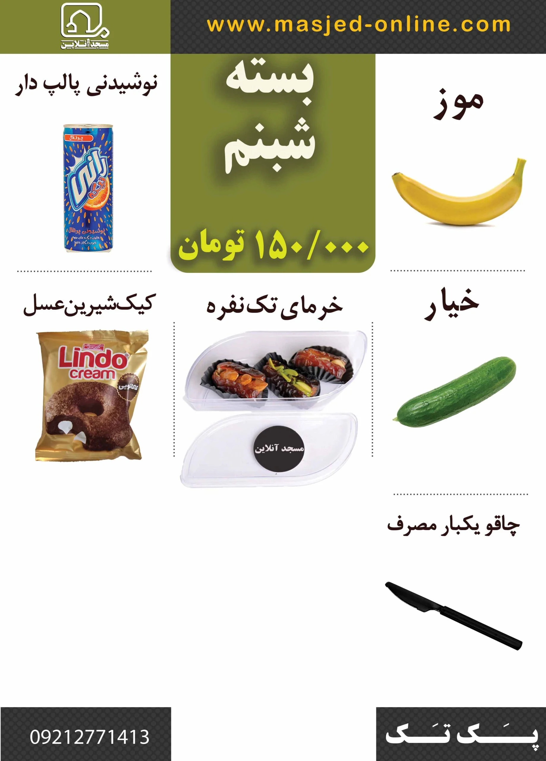موز – رانی – خیار – چاقو یکبار مصرف – کیک شیرین عسل – خرمای تک نفره