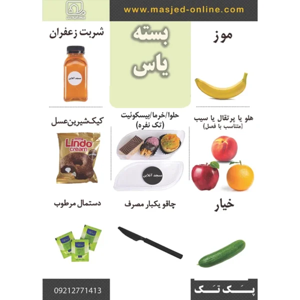 خیار – آبمیوه – موز – آب – حلوا خرما ببسکوییت (تک نفره) – میوه – کیک شیرین عسل – دستمال مرطوب – چاغو یکبار مصرف